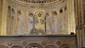 Чуть ниже - исполненная в 1902-1903 годах Литургия ангелов (Евхаристия), удивительно нежная по краскам роспись, полная светлой грусти.