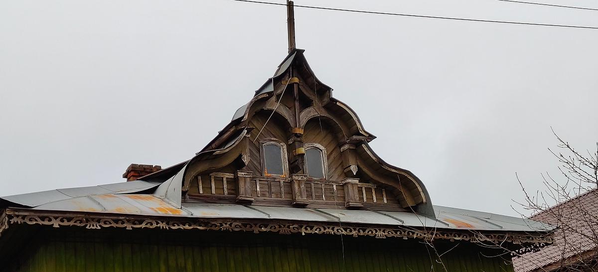 Деревянные дома в городе часто украшены прихотливыми мезонинами с колонками, столбушками и закомарами. Под крышей и на наличниках окон кое-где еще сохранилась резьба (на фото - дом по адресу Слободская ул. 21/6).