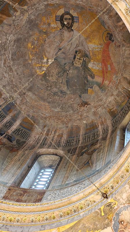 Спас в купольном пространстве неплохо сохранился. Его строгий взгляд перекликается с образами святых евангелистов, написанных по периметру свода.
