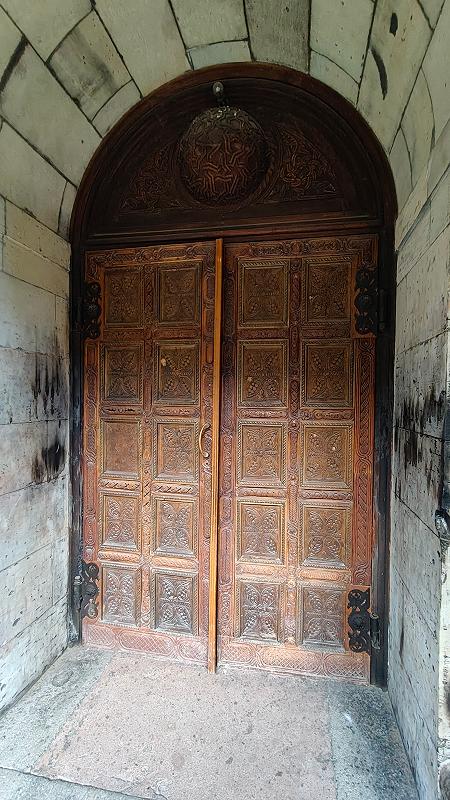 Внутрь ведут деревянные двери, украшенные искусной резьбой с преобладанием растительных мотивов. Верхнее полукружие с традиционным грузинским орнаментом изобилует переплетениями и изгиавми линий.