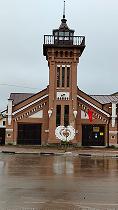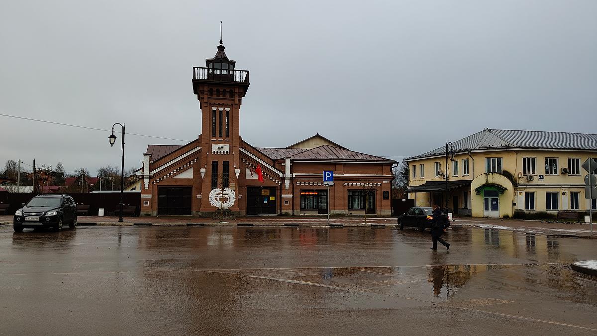 Рядом с храмом - пожарная каланча. Она была совсем руинирована, но, к счастью, местные власти решили восстановить памятник. Здание разобрали и на его фундаменте (с использованием старого кирпича) восстановили строение, устроив в нем Дворец бракосочетаний. Элегантное и достойное решение.